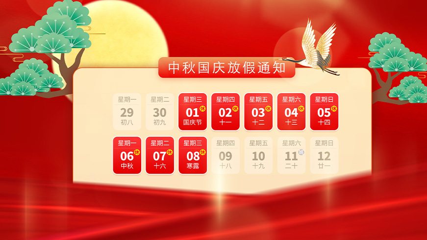 “皓月當空照九州,紅旗漫卷慶華秋”,在這金風送爽、丹桂飄香的美好時節(jié),中秋與國慶佳節(jié)攜手翩然而至。根據(jù)國家法定節(jié)假日的相關規(guī)定,結合公司實際情況,現(xiàn)將我司中秋國慶放假安排通知如下:10月1日至10月8日放假調休,共8天,10月9日上班、10月11日(星期六)正常上班。