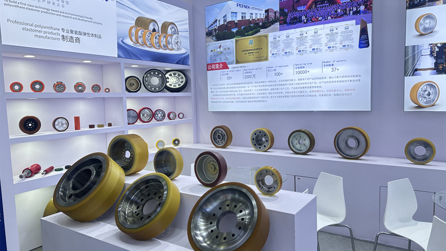 此次展會,上海博盛精心布置了展位,以簡潔大氣的設計風格充分展現(xiàn)了公司的科技實力與專業(yè)形象。展位上,各類聚氨酯彈性體產(chǎn)品整體排放,其中以多種規(guī)格和型號的聚氨酯輪子最為引人注目。這些輪子不僅外觀精美,更在性能上具備高耐磨、高彈性、低噪音等顯著優(yōu)勢,廣泛應用于物流運輸、輸送分揀設備、自動化設備等眾多場景中。